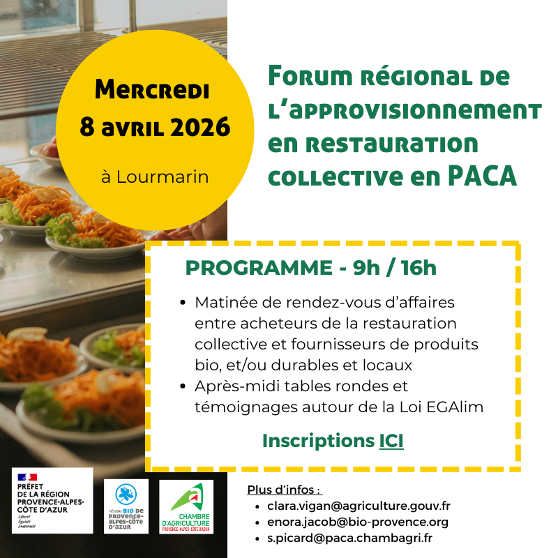 L’ARIA Sud, aux côtés du Préfet de la région Provence-Alpes-Côte d’Azur, de Bio de Provence et de la Chambre d’Agriculture, vous donne rendez-vous le mercredi 8 avril 2026 de 09h à 16h à Lourmarin (La fruitière Numérique, Avenue du 8 Mai D943,84160 Lourmarin) pour favoriser la mise en relation entre fournisseurs et acheteurs de la restauration collective.